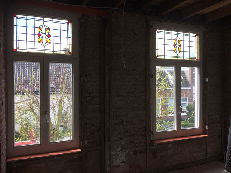 Nieuwe glas in lood ramen voor een oud pand in de wijk villapark in Eindhoven. In samenwerking met de klant zijn we tot het motief gekomen dat bij de stijl en bouwperiode van het huis past.